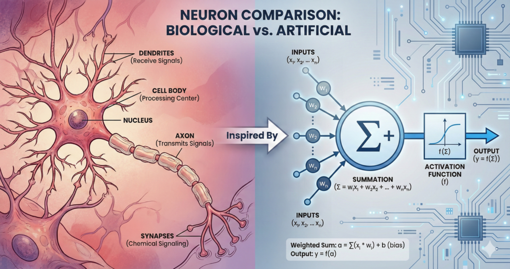 - Each neuron has “weights” (importance levels) and “bias” (threshold)